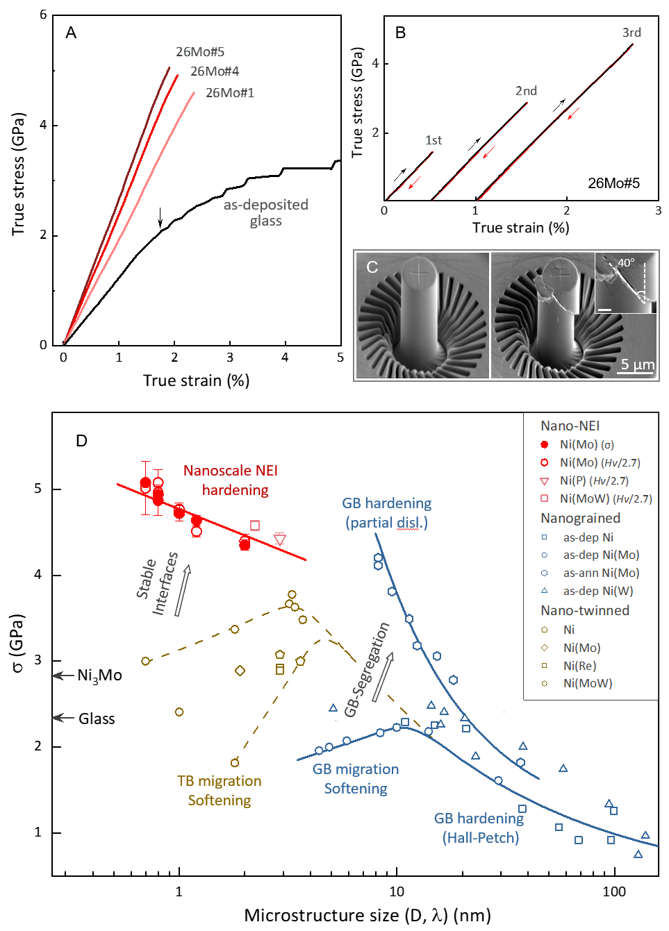 微柱压缩实验测量表明,亚纳米“负能界面”Ni(Mo)固溶体在加载过程中出现完全可逆的弹性变形,塑性变形被有效抑制,最高屈服强度高达5.08 GPa,远高于纳米晶及纳米孪晶镍基合金。这种强化机制与已知的纳米晶和纳米孪晶材料强化机制完全不同。Ni(Mo)固溶体的杨氏模量随界面密度升高显著增加,最高可达254.5 GPa,远超相同成分的非晶和金属间化合物,甚至高于部分氧化物陶瓷材料。杨氏模量的提升可能与亚纳米“负能界面”附近原子尺度应变以及电子局域化有紧密相联。亚纳米“负能界面”Ni(Mo)合金的强度/杨氏模量比为1/40~1/50,接近理论强度,强度接近部分陶瓷材料。在其他材料体系也发现了亚纳米“负能界面”强化效应。